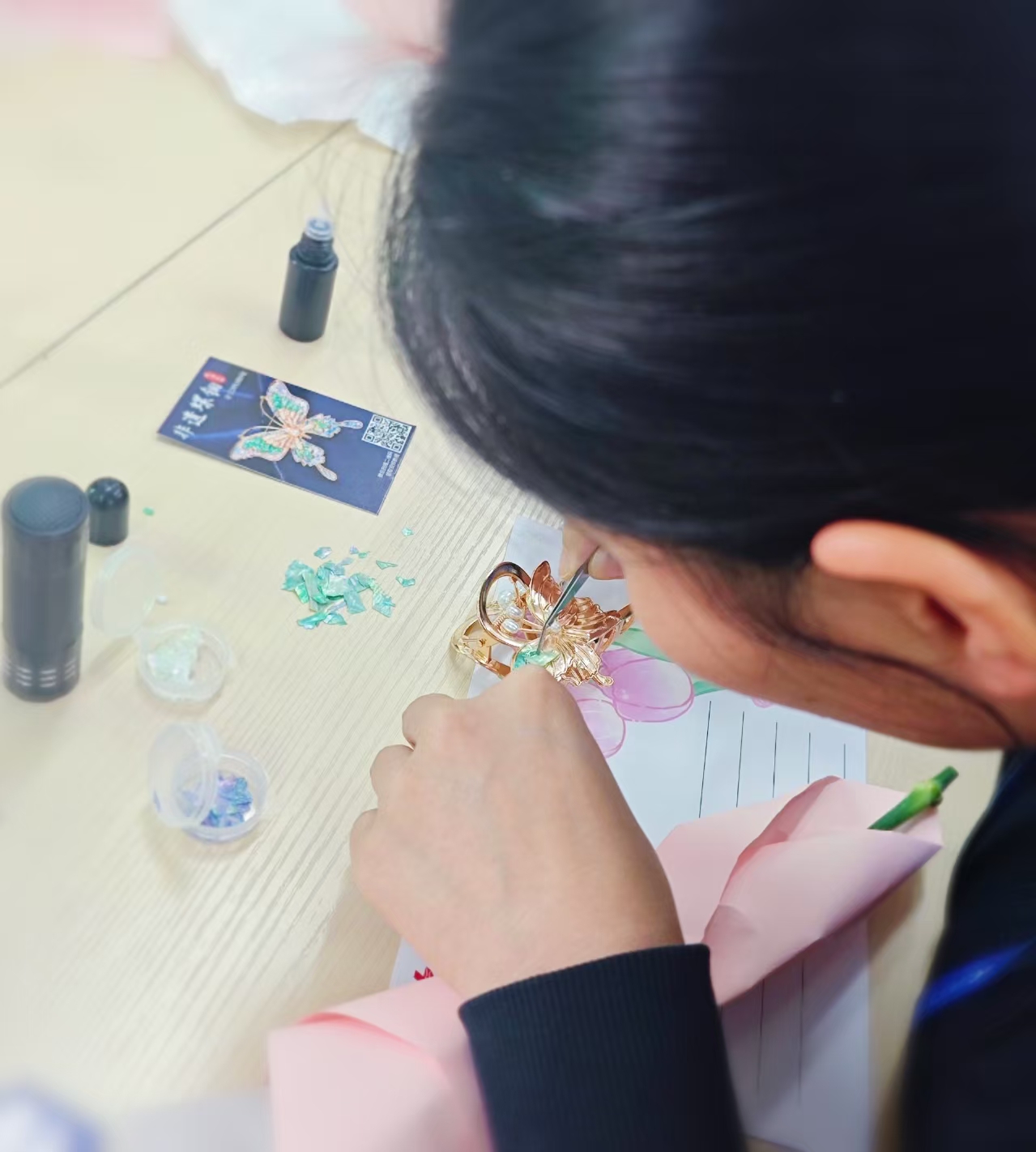 The highlight of the event is the DIY experience of mother of pearl accessories. Under the host's explanation, everyone grouped together to experience this traditional craft, making brooches, hairpins, pendants... Each piece of work requires patience and focus, just as we insist on in our daily work: fine processing and high-quality delivery.